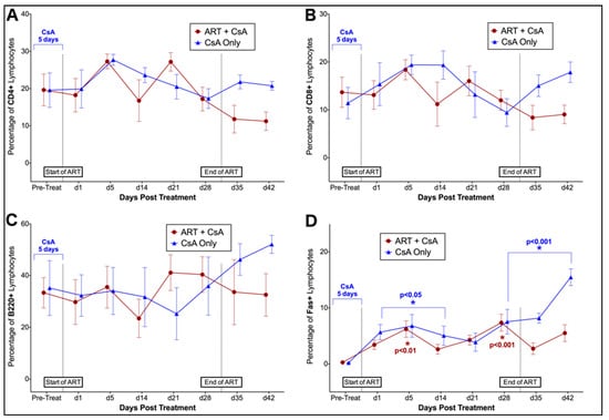 Phase II. Flow cytometry was used to evaluate changes in the percentage of lymphocytes positive for CD4, CD8, Fas, and B220 surface antigens over time in FIV-infected cats in response to treatment with CsA with or without antiretroviral therapy (CsA only, CsA + ART). Over the course of Phase II, no significant differences in CD4+, CD8+, or B220+ lymphocytes were observed in response to 5 days of CsA treatment, or in response to 28 days of ART (Figure 6A–C). However, the proportion of Fas+ lymphocytes changed significantly over time in both CsA only and CsA + ART treated animals (p < 0.0001) (Figure 6D). Cats treated with CsA Only exhibited significantly increased Fas+ cells at day 1, 5, 14, 28, 35, 42 post-treatment, whereas CsA + ART treated cats exhibited increased Fas+ cells at day 5 and 28 (when compared to baseline data).