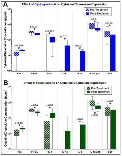 Circulating cytokine and chemokines were quantified in plasma by microsphere immunoassay (MIA) at day -5 (pre-treatment) and day 5 (post-treatment) to detect changes in cytokine expression in FIV-infected cats treated with prednisolone or cyclosporine A. Overall, FIV-infected cats treated with CsA exhibited increased levels of circulating Fas (p < 0.001), IL-4 (p < 0.001), IL13 (p < 0.01), and IL-8 (p < 0.01) compared to baseline levels, while levels of Flt-3L (p < 0.01), IL-12 p40 (p < 0.01), and SCF (p < 0.05) were significantly decreased (Figure 7A). Similar findings were observed in FIV-infected cats treated with prednisolone, which exhibited increased levels of circulating Fas (p < 0.001), Il-4 (p < 0.01), and IL-8 (p < 0.05) compared to baseline data, while levels of Flt-3L (p < 0.05), IL-12 p40 (p < 0.05), and SCF (p < 0.05) were comparatively decreased (Figure 7B).