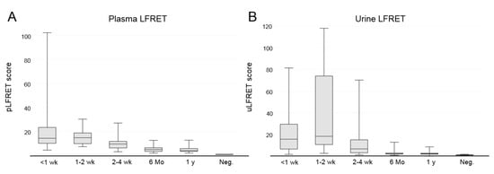 Boxplots of LFRET signals obtained from plasma (pLFRET) and urine (uLFRET): (A) pLFRET values of all plasma samples from the 40 PUUV-patients taken at different time points (<1 week, 1–2 weeks, and 2–4 weeks from onset of fever) of the disease, as well as at the convalescent phase (6 months and 1 year post infection); (B) uLFRET values of all urine samples from the 40 PUUV-patients taken at different time points (<1 week, 1–2 weeks, and 2–4 weeks from onset of fever) of the disease, as well as at the convalescent phase (6 months and 1 year post infection). The y-axis represents normalized TR-FRET values divided by the average of TR-FRET signals induced by the negative-control samples (LFRET score of >2.1 is considered positive). The whiskers represent minimum and maximum values and the boxes represent the 25–75% quartiles.