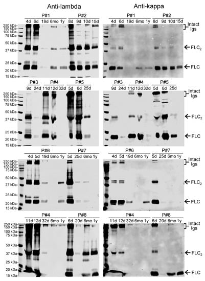 We examined by WB a panel consisting of consecutive urine samples collected during the hospitalization and convalescence of eight patients. The samples (30 μL of urine) were separated on ready-made 4–20% sodium dodecyl sulfate–polyacrylamide electrophoresis (SDS-PAGE) gels (Bio-Rad, Helsinki, Finland) and wet-blotted onto nitrocellulose membranes following standard protocols. The membrane was blocked using 3% skimmed milk in TBS, and sequentially probed with the following antibodies: 1:1000 diluted goat anti-human lambda light chain (Southern Biotech, Birmingham, AL, USA) followed by 1:10,000 diluted IRDye800-labeled donkey anti-goat immunoglobulin (LI-COR Biosciences, Lincoln, NE, USA) and 1:1000 diluted mouse anti-human free kappa light chains (Abcam, Cambridge, MA, USA) followed by 1:10,000 diluted AF680-labeled donkey anti-mouse immunoglobulin (LI-COR Biosciences). All antibody incubations were in T-TBS (TBS+0.05% Triton-X-100) with 3% skimmed milk; all washing steps were with T-TBS. The membranes were washed three times with TBS prior to recording the results with an Odyssey Infrared Imaging System (LI-COR Biosciences).