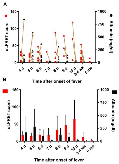 Kinetic analysis on the level of the uLFRET signal in relation to proteinuria. The uLFRET scores were plotted together with albumin levels in urine samples at 4–10 days after onset of fever (acute stage) together with recovery (3–4 weeks) and 6 months (only uLFRET values were available at 6 months). Only time points where N was at least three were included. The y-axis, “uLFRET score”, represents normalized TR-FRET values divided by the average of the TR-FRET signals induced by the negative-control samples (signal/background): (A) The individual uLFRET and protein values in each sample are shown and connected by a line; (B) Average uLFRET signals and level of proteinuria (albumin) at different time points are shown as mean + standard deviation.