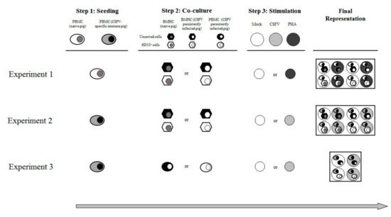 The functional assay comprised three experiments (Figure 1). For the first experiment, in step one, PBMCs from two naïve animals (pigs 10 and 11) were seeded by triplicate at a ratio of 3 × 105 cells/well in a previously coated ELISPOT plate. In step two, the PBMCs were co-cultured with either unsorted BMHCs or 6D10+ BMHC cell subset. These cells were added at a rate of 1 × 105 cells/well. The BMHCs had been collected from either naïve (pigs 10 to 12) or CSFV persistently infected animals (pigs 1 to 3). During step 3, the samples were either stimulated with phytohaemagglutinin (PHA) (10 µg/mL) or incubated in RPMI medium supplemented with 10% FBS (mock stimulated) for 72 h (Figure 1). Control wells containing only PBMCs, which were also mock or PHA stimulated, were included in the study.