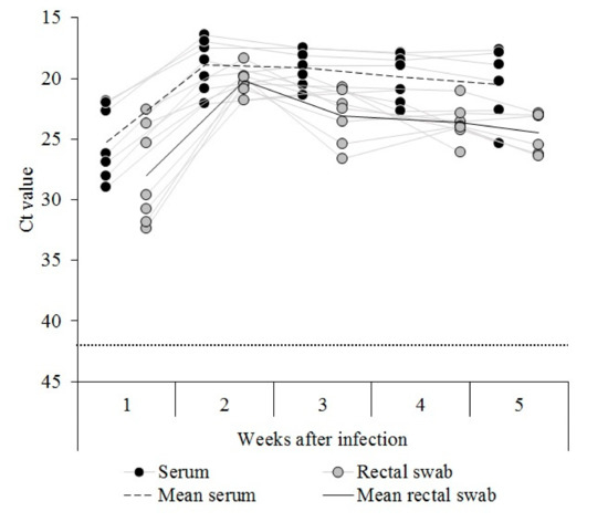 RNA detection in the sera and rectal swabs from the Cat01 infected pigs. Classical swine fever virus (CSFV) RNA was evaluated weekly in the sera (black dots) and rectal swab (gray dots) samples for 5 weeks after infection. Ct values above 42 (dotted line) were considered negative. Mean values for the serum and rectal swab samples are also indicated.