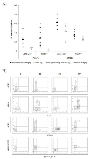 Illustration of cell surface markers in peripheral blood mononuclear cells (PBMC) and bone marrow haematopoietic cells (BMHC) from CSFV persistently infected and naïve animals at 6 weeks of age. (A) Comparative expression of CD172a (myelomonocytic cells) and 6D10 (granulocyte lineage) cell surface markers in PBMCs and BMHCs from CSFV persistently infected (black dots) and naïve (white dots) animals. Mean values for each group are indicated (triangle symbol). (B) Comparative expression of MDSC surface markers labelled by single (6D10), double (6D10/CD33 and 6D10/CD11b), and triple (6D10/CD33/CD11b) staining in different cell populations (in the bottom panels, 6D10+ cells were gated and the expression of CD33vs CD11b analysed). The cell populations evaluated were: I) BMHC from a naïve animal, II) BMHC from a CSFV persistently infected animal, III) PBMC from a naïve animal, and IV) PBMC from a CSFV persistently infected animal. The experiments were repeated twice under the same conditions.