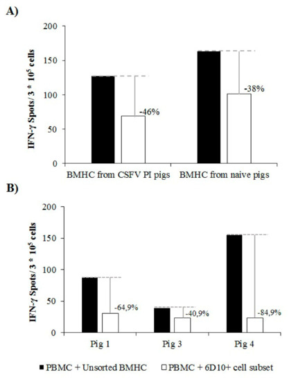 PBMCs from naïve animals showed a normal response in terms of IFN-γ when stimulated with PHA in the absence of any co-culture (200–250 IFN-γ spots/ 3 × 105 cells). The mean IFN-γ production after PHA stimulation in PBMCs from naïve animals was 150 and 90 IFN-γ spots/ 3 × 105 cells when these cells were co-cultured in the presence of the whole BMHC or 6D10+ cell populations from naïve animals, respectively (reduction of 38%, Figure 5A). A slightly higher reduction in the IFN-γ response was observed after co-culture of the same PBMC from naïve animals with the different BMHC cell subsets from CSFV PI animals. In this regard, the IFN-γ response was reduced by 46% when the cells were co-cultured with the 6D10+subset compared to the co-culture and stimulation with the whole BMHC population. Specifically, around 130 and 70 IFN-γ spots/ 3 × 105 cells were evidenced for PBMCs co-cultured with the unsorted BMHC and the 6D10+ cell subsets, respectively (Figure 5A).