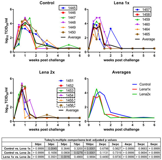 Viremia of Lena-vaccinated pigs following homologous challenge infection. Viremia was determined by titration on PAMs collected from porcine reproductive and respiratory syndrome virus (PRRSV)-negative pigs and IPMA. Pigs in the control group received two injections of PBS + adjuvant, eight and four weeks before the challenge. Group “Lena 1x” was vaccinated once with inactivated Lena, four weeks before the challenge. The group “Lena 2x” was vaccinated twice at eight and four weeks before the challenge. dpc—days post-challenge, wpc—weeks post-challenge. Numbers (1451–1465) represent the individual pigs. Solid rectangles around pig numbers mean they have been used in all ADE experiments, dashed rectangles mean that their sera have also been further analyzed, but not in all ADE experiments. The black line is the average of each group. Statistical analysis was performed with RM 2-way ANOVA, followed by Tukey’s multiple comparison test. Statistically significant values are highlighted in grey in the table under the graphs.