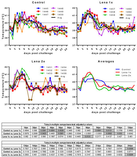 Body temperature after challenge. Control, Lena 1x, and Lena 2x: Colored lines represent individual animals and thick black lines represent the mean value for each group. Temperature >40 °C was considered as fever (dotted line on upper panel). dpc—days post-challenge. Statistical analysis was performed with an ordinary 2-way ANOVA, followed by Tukey’s multiple comparison test. Statistically significant values are highlighted in grey in the table under the graphs.