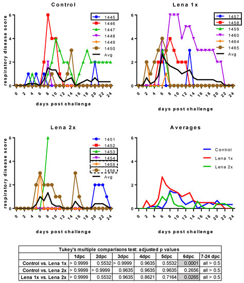 Respiratory disease scores after challenge. Control, Lena 1x, and Lena 2x: Colored lines represent individual animals and thick black lines represent the mean value for each group. Scores: 0 = normal; 1 = mild dyspnea and/or tachypnea when stressed; 2 = mild dyspnea and/or tachypnea at rest; 3 = moderate dyspnea and/or tachypnea when stressed; 4 = moderate dyspnea and/or tachypnea at rest; 5 = severe dyspnea and/or tachypnea when stressed; 6 = severe dyspnea and/or tachypnea at rest. dpc—days post-challenge. Statistical analysis was performed with an ordinary 2-way ANOVA, followed by Tukey’s multiple comparison test. Statistically significant values are highlighted in grey in the table under the graphs.