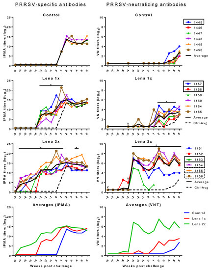 PRRSV-specific IPMA (left) and VN (right) antibodies before and after challenge 105 TCID50 PRRSV Lena. Control pigs received two injections of PBS in adjuvant, at eight and four weeks before the challenge. Group “Lena 1x” was vaccinated once, four weeks before the challenge. Group “Lena 2x” received a prime/booster vaccination at eight and four weeks before the challenge. PRRSV-specific antibodies were detected by IPMA. PRRSV-neutralizing antibodies were detected by a virus neutralization assay (VNT). Colored lines with symbols represent individual pigs. Solid black lines represent the average of each group and dashed black lines represent the average of the control group. v—vaccination; numbers represent individual pig numbers. Solid rectangles around pig numbers mean they have been used in all ADE experiments, dashed rectangles mean their sera have also been further analyzed, but not in all ADE experiments. Statistical analysis was performed with RM 2-way ANOVA, followed by Tukey’s multiple comparison test. The comparison was: Lena 1x vs. Control, and Lena 2x vs. Control. p < 0.05 was considered statistically significant and is represented by *.