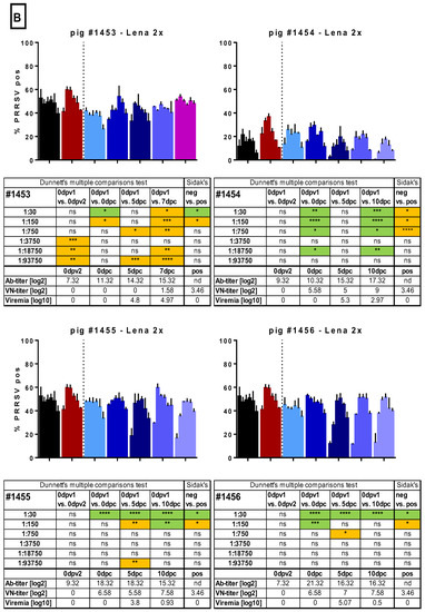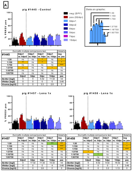 Macrophage infection in the presence of immune sera. Sera of several randomly selected pigs from the different groups were tested for their ability to enhance the infection of monocyte-derived macrophages (MDMs). Serial dilutions (1:30 to 1:93,750) of the sera were pre-incubated with Lena. Then, MDMs were infected in triplicates and tested PRRSV N-protein after 16 h by flow cytometry. In A, the results for pig #1445, from the control group, which received 2 injections of PBS + adjuvant, as well as the results for pigs #1457 and #1458, from the “Lena 1x” group, which were vaccinated once, is shown. In B. the results for pigs #1453–1456, from the “Lena 2x” group, which were vaccinated twice, is shown. Bars show mean with SD. dpv—days post-vaccination, dpc—days post-challenge, dpi—days post-infection; 0dpv1 = eight weeks before challenge, 0dpv2 = four weeks before challenge. Statistical analysis was performed with ordinary 2-way ANOVA, followed by Dunnett’s multiple comparison test or Sidak’s post hoc test, as indicated. Green highlighting indicates a neutralizing effect, while orange highlighting indicates an enhancing effect. Symbols: * = p < 0.05, ** = p < 0.01, *** = p < 0.001, **** = p < 0.0001.