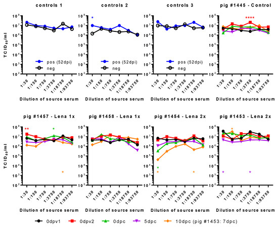 In conclusion, these tests did not permit us to identify ADE as a possible cause of enhanced disease. Furthermore, the MDM assay system based on nucleoprotein measurement of infectivity was not robust in terms of its reproducibility. We, therefore, tested if viral progeny from these cultures was influenced by the different sera (Figure 6). In three independent cultures, the positive control serum induced only once increased viral shedding at a 1:30 dilution. Curiously, we found that, indeed, the serum of pig #1445 of 0dpv2 led to increased shedding of virus. It is the same serum and dilution that had also led to a higher percentage of infected MDMs, while the pig had not been exposed to any vaccine or virus, yet. We also observed two small, yet statistically significant, increases for pig #1457 with the sera 0dpv2, 1:30, and 0dpc, 1:3750, and a reduced titer for 10dpc, 1:18,750, all of which did not correspond to any increase or reduction in infection of MDMs. None of the SNs of the sera tested for pig #1458 differed significantly from the control. For pig #1454 from the Lena 2x group, we saw a clear reduction in the viral titers at 1:30 10 dpc.
