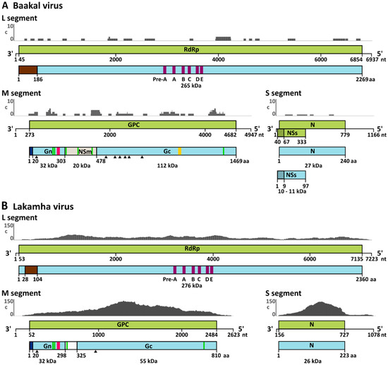 Schematic genome organization of Baakal (BKAV) (A) and Lakamha (LAKV) (B) viruses. Open reading frames (ORF) are shown in green boxes and predicted corresponding proteins are depicted as light blue boxes. Genome positions and predicted protein masses are indicated. The endonuclease domain is shown as a brown box. The putative signal peptide is indicated by a dark blue box. Predicted N-linked glycosylation sites are shown as black triangles. Green boxes are representing putative transmembrane domains. Gn zinc finger motif and Gc fusion peptide motif are depicted as pink and orange boxes, respectively. The graph above each genome segment shows the distribution and number of obtained NGS reads. The y-axis indicates the coverage (c), the maximum number of overlapping reads per genome position.