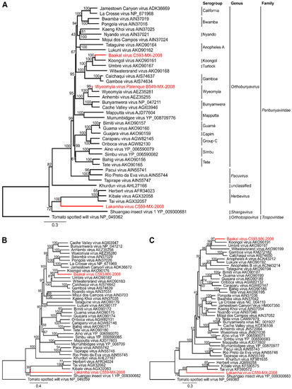 Phylogeny of representative peribunyaviruses and the three novel Mexican viruses. Maximum likelihood [27] trees of the RdRp protein (A), the glycoprotein precursor (B) and the nucleocapsid (C) are shown. For phylogenetic inference the deduced aa sequences of each genome segment were aligned with sequences of representative peribunyaviruses. ML trees were calculated using the Blosum62 substitution model. Tree topology was supported by bootstrap analyses with 1000 replicates. Tomato spotted wilt virus (family Tospoviridae, genus Orthotospovirus) was used as an outgroup. Accession numbers are depicted behind species names. Viruses identified in this study are shown in red.