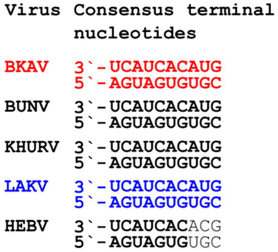 Conserved terminal nucleotides. The genome termini of the BKAV (red) and LAKV (blue) compared to representative peribunyaviruses are shown. BUNV, Bunyamwerea virus (genus Orthobunyavirus); KHURV, Khurdun virus (unclassified); and HEBV, Herbert virus (genus Herbevirus).