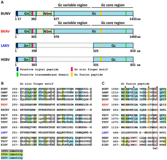 Peribunyavirus glycoprotein precursor protein organization. (A) Diagram of glycoprotein precursor protein domains. Regions not present in LAKV and HEBV are indicated as dotted box. Alignment of conserved amino acids of the (B) Gn zinc finger motif and the (C) Gc fusion petide. Conserved amino acids shaded in grey, light green and light blue indicate 100%, 75%, or 50% identity, respectively. Conserved cysteins are shown in red.