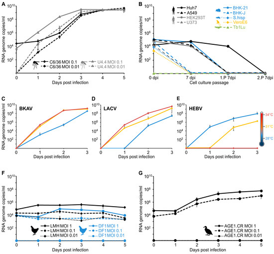 Replication of BKAV in different insect and vertebrate cell lines. (A) The insect cells C6/36 and U4.4 were infected in duplicate with MOI 0.1 and 0.01. Samples were taken daily over a five-day period. (B) The mammalian cell lines BHK-21, BHK-J, VeroE6, Huh7, HEK293T, A549, U373, Tb1Lu, and S.hisp were infected with MOI 10 and cell culture supernatant was passaged twice onto fresh cells after seven days. Samples were taken on day of infection (0 dpi), after 7 days (7 dpi) and at the end of passage one (1.P 7 dpi) and two (2.P 7 dpi). (C) BKAV replication in C6/36 cells was investigated at three different temperatures and compared to that of (D) La Crosse virus (LACV) and (E) Herbert virus (HEBV). Cells were infected in duplicates with an MOI of 0.01. Samples were taken daily for three days. Further BKAV replication was investigated in the two chicken cell lines LMH and DF1 (F) and in the anatine cell line AGE1.CR (G). Cells were infected in duplicates with MOIs of 1, 0.1, and 0.01. Samples were taken daily over a five-day period. Viral RNA genome copy numbers in all investigated cell culture supernatants were measured by real-time RT-PCR.