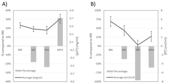 As with the capsid protein, RT activity was not detected in FIV+ cats. On the other hand, the RT activity was detectable in 66.6%, 28.0%, 31.8%, and 58.3% of the treated FeLV+ cats at M0, M2, M4 and M10, respectively. Around three fourths of the cats that had a positive RT activity value at M0 had a decreased reading at M2 and M4, but a much smaller percentage had an improved RT activity value at M10 (Figure 1C). In addition, the detection of RT activity increased progressively in cats in which it was initially undetectable (Figure 1D). The highest improvement on the RT activity of treated FeLV+ cats was observed at M2, when the highest percentage of these cats had undetectable levels of this parameter. However, the concentration of RT activity was the lowest at M4, over 95% lower than at M0, increasing when treatment was discontinued (Figure 2B). All these results support the “rebound pattern” mentioned above. No significant differences were observed in the progress of RT activity in relation to clinical status at M0.