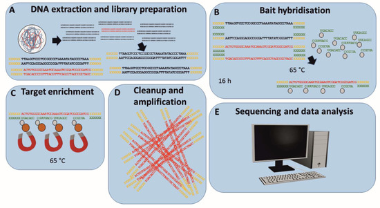 Workflow for the enrichment of ASFV-specific target sequences using MyBaits® (Arbor Bioscience) prior to Illumina MiSeq sequencing. Extracted DNA including ASFV target sequences (red) is fragmented and library is prepared by adding Illumina specific sequencing adapters (yellow) (A). After initial denaturation (95 °C), the library is cooled to hybridisation temperature (65 °C) and adapter specific blocking oligos (green) are added to prevent the re-hybridisation of adapter sequences during bait hybridisation (B). Biotinylated ASFV-specific RNA baits are added to the blocked library, and the reaction is incubated at hybridisation temperature for 16 h (B). Streptavidin-coated magnetic beads are added and bind to biotinylated RNA baits hybridised to ASFV target sequences (C). After magnetic separation and washing (C), ASFV target sequences are eluted from the baits and amplified (D). ASFV read-enriched libraries are sequenced on an Illumina MiSeq, and the resulting data are analysed in silico (E).
