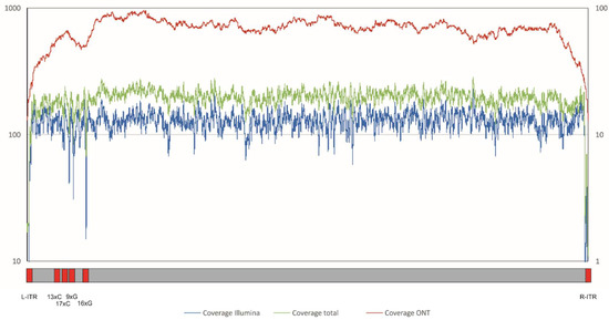 Through the employment of single molecule Nanopore sequencing (Figure 4), we were able to generate long viral reads of up to 43.5 kb. However, the low accuracy of the Nanopore reads (see above) hampers precise consensus sequence generation. While Nanopore reads reach an accuracy of around 90%, Illumina data sets usually have accuracies around 99.9%. Hence, the higher accuracy of the Illumina data sets can be used for better precision, whereas the Nanopore reads can be taken for correct assembly. Therefore, using these in a hybrid assembly, we were able to further improve the sequence quality, especially in the ITR regions. Although we were able to enlarge the ITR regions considerably, because of the decreasing sequence coverage at the ends, we cannot exclude the possibility that they are even longer. Due to their proposed involvement in ASFV replication involving head to head concatemers [61] (similar to poxviruses [62]), a complete sequence of the ITR regions including the terminal hairpin loops [63] would be especially interesting.