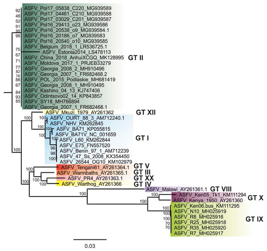 - Farlow, J.; Donduashvili, M.; Kokhreidze, M.; Kotorashvili, A.; Vepkhvadze, N.G.; Kotaria, N.; Gulbani, A. Intra-epidemic genome variation in highly pathogenic African swine fever virus (ASFV) from the country of Georgia. Virol. J. 2018, 15, 190. [Google Scholar] [CrossRef] [PubMed]