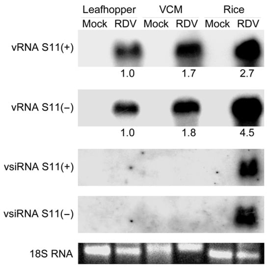 Accumulation of RDV genomic RNA S11 and vsiRNAs in different hosts. Northern blot assay of RDV genomic RNA and vsiRNAs in leafhoppers, vector cells in monolayer (VCMs), and rice. The 18S RNA served as a loading control. Mock—non-viruliferous insects or plants; RDV—viruliferous hosts; (+)—positive-strand RNA; (−)—negative-strand RNA; vRNA—RDV genomic RNA. Gel blot signals were quantified, and the relative intensities are shown below each lane.