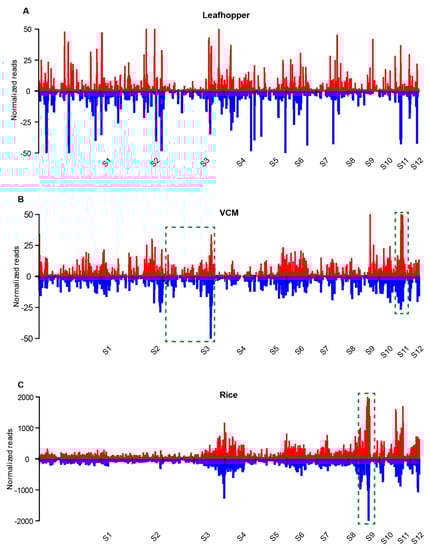 Genomic view of RDV vsiRNAs from RDV-infected leafhoppers (A), VCMs (B), and rice plants (C). vsiRNAs per million total sequenced small RNAs are plotted against the positive (red) or negative (blue) strands of the 12 RDV genomic RNAs (S1–S12) using a 20-nt window. Green boxes on S3 and S11 in VCM and S9 in rice represent the hotspots of vsiRNAs clustered at the terminal regions of genomic RNAs.