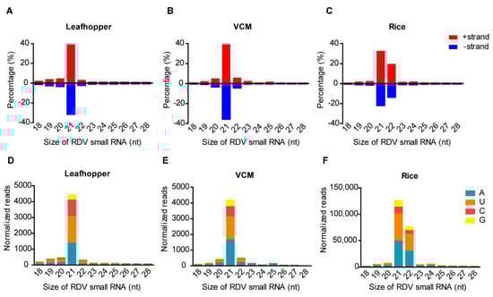 vsiRNA profiles of RDV-infected leafhoppers, VCMs, and rice plants. (A–C) Size distributions of RDV-derived small RNAs in the libraries from each species based on deep sequencing data. Percentages of positive-strand (top red bars) and negative-strand (bottom blue bars) vsiRNAs in the length range of 18 to 28 nt are shown. (D–F) Base preference for 5′-terminal first nucleotide of vsiRNAs of each length in the three libraries. A, U, C, and G represent adenine, uracil, cytosine, and guanine, respectively.