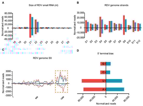 3.2. vsiRNAs Are Differentially Produced in Leafhopper and Rice Response to RDV Infection