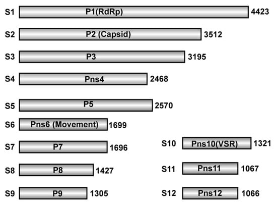 RDV, a member of the genus phytoreovirus in the family Reoviridae, replicates O. sativa in its plant host. RDV is transmitted by the leafhopper insect vector Nephotettix cincticeps in a propagative manner. The RDV genome comprises 12 dsRNA segments (S1–S12) encoding seven structural proteins and five nonstructural proteins (Scheme 1) [,,,]. In this study, we used deep sequencing to characterize RDV-derived vsiRNAs in rice and leafhopper, two natural RDV hosts from different kingdoms, to develop a foundation for further studies on the evolution of RNA silencing-based relationships between a virus and its cross-kingdom hosts.