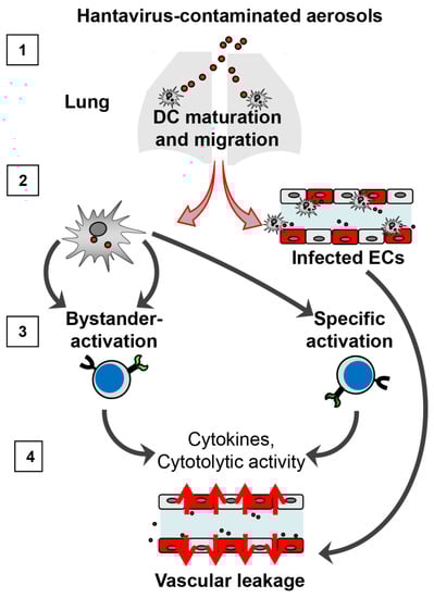 Dendritic cells (DCs) as “fire accelerants” in hantavirus-induced pathogenesis. (1) After inhalation, pathogenic hantaviruses may productively infect DC subsets in close contact with the respiratory epithelium/alveolar interstitium, thereby inducing DC maturation and migration. (2) Hantavirus-infected DCs can act as shuttles that safely transport virions to endothelial cells (ECs), the main arena of hantavirus-induced pathogenesis, resulting in vascular leakage, and lymphoid tissue, where immune cells are activated. (3) Hantaviruses-infected DCs cause massive bystander activation of immune cells (CD8+ T cells, B cells, NK cells). Bystander-activated immune cells may in turn license DCs cross-presenting hantaviral antigen to initiate powerful hantavirus-specific adaptive immune responses. (4) Both bystander-activated cells and hantavirus-specific immune cells may further aggravate vascular damage by attacking ECs not protected by expression of inhibitory molecules such as PD-L1 or by secreting cytokines that enhance vascular permeability (e.g., IFN-γ).