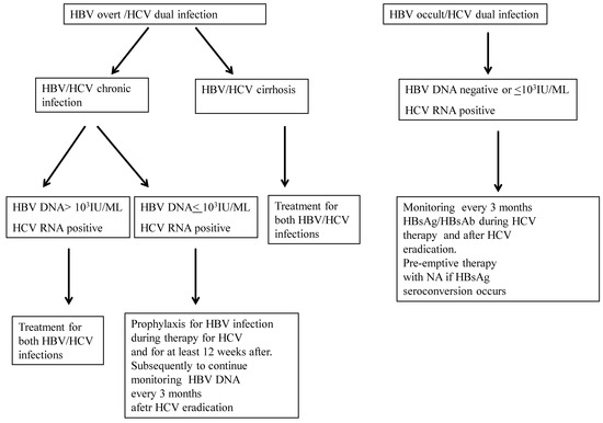 Figure 1 shows how, in our opinion, HBV infection should be managed during and after the eradication of HCV infection. Also in agreement with the guidelines of the European Association for the Study of the Liver, before the start of DAA all patients should be screened for HBsAg and anti-HBs and anti-HBc. The HBsAg-positive patients who fulfill the standard criteria for HBV treatment should receive nucleo(s)tide analog (NA) treatment at the same time as DAA therapy. Those who do not fulfill the criteria should be treated prophylactically with NA during, and 12 weeks following, DAA treatment, except for patients with liver cirrhosis for whom NA should be continued [50,55]. For those patients with occult hepatitis B infection there are no sufficient recommendations to start prophylactic treatment. The HBsAg-negative patients at risk of occult HBV infection (anti-HBc-positive subjects) should be monitored for HBsAg every three months during DAA and for 12 weeks after stopping treatment.