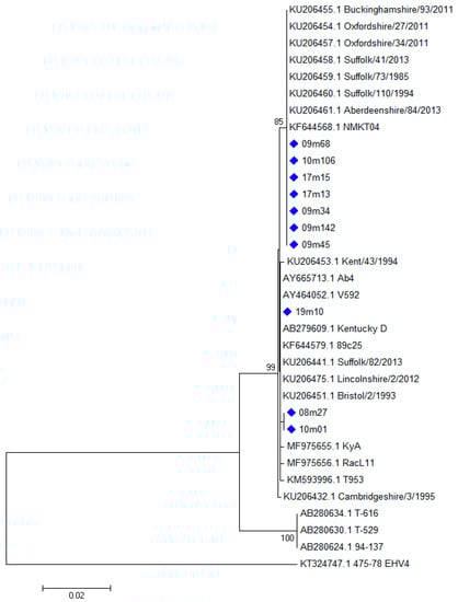 Phylogenetic tree showing the evolutionary history of the ORF33 sequences from nt 1525 to nt 2409 (Neighbor-Joining method with bootstrap test with 1000 replicates). The evolutionary distances were computed using the Kimura 2-parameter method and are in the units of the number of base substitutions per site. The rate variation among sites was modeled with a gamma distribution (shape parameter = 5). Sequences obtained in this study are marked with a diamond (♦).