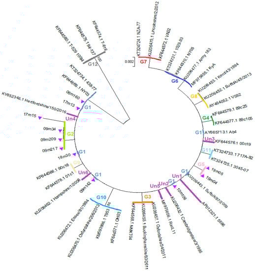 The evolutionary history of the ORF34 sequences was obtained by Neighbor-Joining method with bootstrap test with 1000 replicates. The evolutionary distances were computed using the Tamura 3-parameter method and are in the units of the number of base substitutions per site. Sequences obtained in this study are marked with a triangle ▲. The letter “G” followed by a number indicates the number of the group where the sequences are located. The letters “Un” followed by a number indicates the sequences not located in any Group.