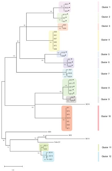 - Cortés, P.; Spricigo, D.A.; Bardina, C.; Llagostera, M. Remarkable diversity of Salmonella bacteriophages in swine and poultry. FEMS Microbiol. Lett. 2015, 362, 1–7. [Google Scholar] [CrossRef] [PubMed]