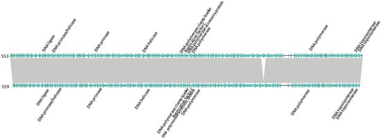 - Sullivan, M.J.; Petty, N.K.; Beatson, S.A. Easyfig: A genome comparison visualizer. Bioinformatics 2011, 27, 1009–1010. [Google Scholar] [CrossRef] [PubMed]