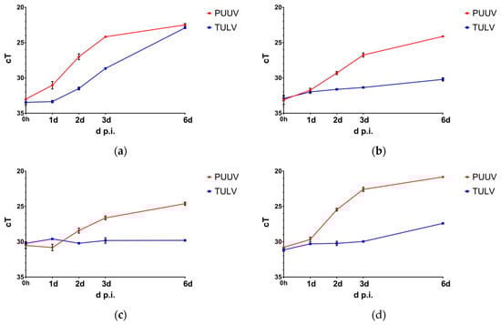 In this study, we compared the replication of TULV and PUUV in human epithelial and endothelial cells, as well as in cells of the monocyte–macrophage lineage. The cells were infected with a multiplicity of infection (MoI) of 0.1 and viral RNA concentrations in the cell culture supernatants were quantified via qRT-PCR at 0 h to 6 d p.i. (Figure 1). All experiments were performed in duplicate using RNA samples from two independently infected cell cultures for each analysis.