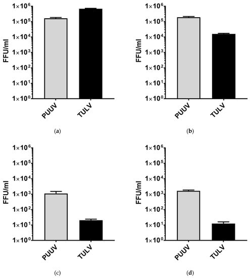 PUUV (strain Kazan) [] and TULV (strain Moravia-5302Ma-94) [] were grown on Vero E6 cells (American Type Culture Collection (ATCC), Manassas, VA, USA; CRL 1586) in T175 cell culture flasks under standard cell culture conditions (Dulbecco’s Modified Eagle’s Medium (DMEM), 5% fetal calf serum (FCS), 37 °C). Cells were infected in 2 mL of DMEM containing 1% FCS for 2 h using a multiplicity of infection (MoI) of 0.005. Subsequently, 28 mL of DMEM medium containing 5% FCS were added and the cells were incubated for 7 d. At 7 d p.i. 20 mL of the virus containing cell culture supernatant were harvested, followed by a centrifugation step to remove cellular debris (1000× g, 5 min, 4 °C). The cells were disrupted in the remaining 10 mL of medium by three consecutive freeze/thaw cycles (−20 °C) followed by sonication (Bioruptor Plus, Diagenode SA, Seraing, Belgium; 3 × 30 s, 4 °C, high intensity) and removal of cellular debris via centrifugation (1000× g, 5 min, 4 °C). Subsequently, the virus containing supernatants were pooled and viral particles were enriched via sucrose cushion ultracentrifugation (30% sucrose; 175,000× g, 1.5 h, 4 °C). Viral stocks were titrated by focus forming unit (FFU) assay and stored in aliquots at −80 °C for further use. Stocks of comparable virus titers of approximately 1 × 107 FFU/mL were used for infection experiments. All virus stocks were tested and found to be negative for mycoplasma and SV5 contamination. Biosafety level 2 facilities were used for virus cultivation and experimental infections.