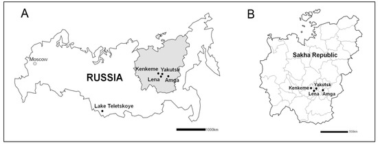 Maps showing (A) the location of the Sakha Republic in Far Eastern Russia, and (B) the small mammal collection sites in the Sakha Republic, where hantavirus-infected Sorex shrews were captured in July and August 2006.