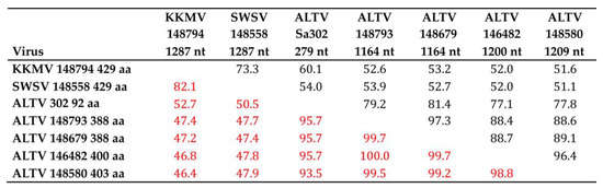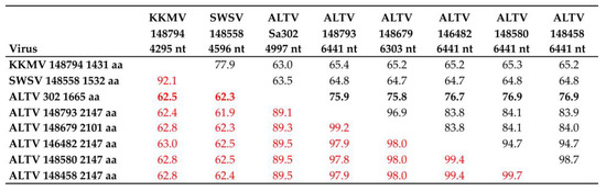 Pairwise alignment and comparison of nucleotide and amino acid L-segment sequences of prototype Kenkeme virus (KKMV Sr422/MSB148794), Seewis virus (SWSV Sca371/MSB148558), Altai virus (ALTV Telet-Sa302) and representative ALTV-like hantaviruses (Sca363/MSB146482, Sca370/MSB148580, Sca377/MSB148458, Sca402/MSB148793 and Sr424/MSB148679).