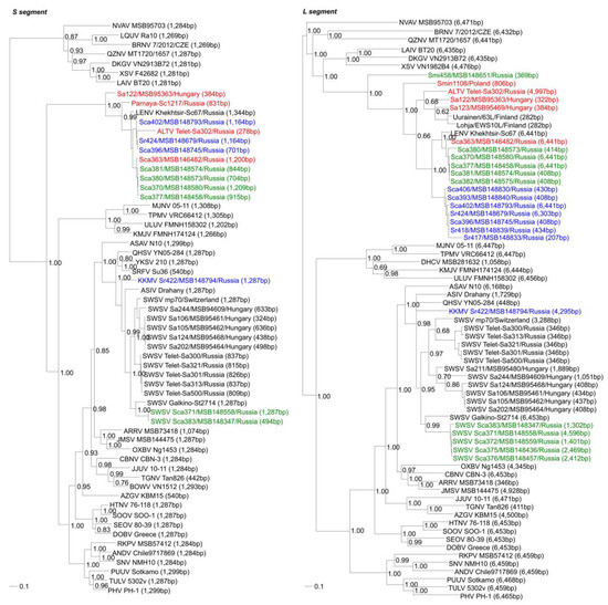 GenBank accession numbers for the ALTV-like hantavirus sequences include Sa122/MSB95363 (S: GQ293127; L: GQ293104) and Sa123/MSB95469 (L: GQ293105) from Hungary; and Sca363/MSB146482 (S: KM361043; L: KM361055), Sca370/MSB148580 (S: KM361044; M: KM361051; L: KM361056), Sca377 MSB148458 (S: KM361045; M: KM361052; L: KM361057), Sca380/MSB148573 (S: KM361046; L: KM361058), Sca381/MSB148574 (S: KM361047; L: KM361059), Sca382/MSB148575 (L: MN401400), Sca393/MSB148840 (L: MN401399), Sca396/MSB148745 (S: KM361050; L: KM361060), Sca402/MSB148793 (S: KM361048; M: KM361053; L: KM361061), Sca406/MSB148830 (L:MN401398), Sr417/MSB148833 (L: MN401401), Sr418/MSB148839 (L: KM361062), Sr424/MSB148679 (S: KM361049; M: KM361054; L: KM361063) and Parnaya-Sc1217 (S: KM362174) from Russia, as well as ALTV-like hantavirus strains Uurainen/63L (L: KJ136623) and Lohja/EWS10L (L: KJ136638) from Finland. Also, new orthohantavirus sequences include Seewis virus (SWSV) SWSV Sa105/MSB95462 (S: GQ293124; L: GQ293097), SWSV Sa106/MSB95461 (S: GU186442; L: GQ293098), SWSV Sa124/MSB95468 (S: GQ293128; L: GQ293106), SWSV Sa202/MSB95464 (S: GQ293137; L: GQ293117), SWSV Sa211/MSB95480 (L: GQ293121), SWSV Sa244/MSB94609 (S: CQ293138; L: CQ293123) from Hungary, and SWSV Sca371/MSB148558 (S: KM201411; L: KM201413), SWSV Sca372/MSB148559 (L: KM201414), SWSV Sca375/MSB148436 (L: KM201416), SWSV Sca376/MSB148457 (L: KM201418), SWSV Sca383/MSB148347 (S: KM201419; L: KM201421) from the Sakha Republic, and SWSV Telet-Sa300 (S: GQ284578; L: EU424334), SWSV Telet-Sa301 (S: GQ284577; L: EU424335), SWSV Telet-Sa313 (S: GQ284579; L: EU424336), SWSV Telet-Sa321 (S: GQ284575; L: EU424337), SWSV Telet-Sa500 (S: GQ284576; L: EU424338) from Teletskoye Lake in the Altai Republic.