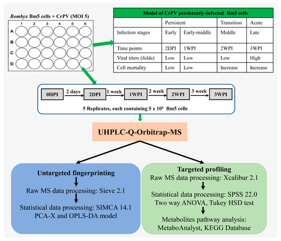 As illustrated in Figure 1, Bm5 cells were seeded at 4 × 105/mL in a 12-well plate followed by inoculation with CrPV at multiplicity of infection (MOI) of 5. At the end of every week, Bm5 cells were sub-cultured at 1:1 (v:v) with fresh medium. Samples were withdrawn for metabolomics analysis at four time points that correlate with different steps of the viral infection process: Early (2DPI, 2 days post-infection), early–middle (1WPI, 1 week post-infection), middle (2WPI, 2 weeks post-infection) and late (3WPI, 3 weeks post-infection). The sample collection therefore covered the period of persistent infection by CrPV (2DPI, 1WPI), the transition to pathogenic infection with increased mortality (2WPI) and acute infection (3WPI) [24], whereas cellular extracts before infection by CrPV (0HPI) were prepared as control group. At each sampling time point, one well of the 12-well plate was used for quantification of cell numbers. Consequently, the same amount of Bm5 cells (5 × 105 cells) was used for metabolite extraction at each time point. At approximately four hours before extraction, an identical amount of cells was seeded in new wells, making sure that cells at the same confluency were extracted in each sample.