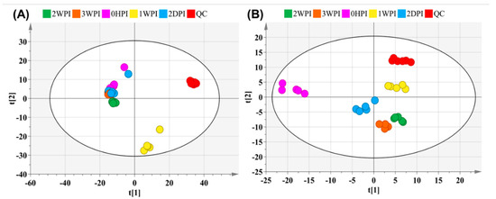 Principal component analysis (PCA)-X score plot of all analyzed samples of Bm5 cells after CrPV infection. The PCA score plot is presented separately for the positive (A) and negative ion mode (B). The red and other colors represent the internal quality control (QC) and different time points samples, respectively.