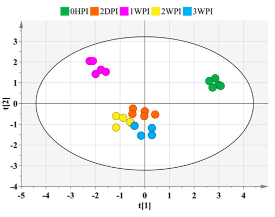 Score plot generated from the PCA-X of targeted metabolites. Mapped are 59 identified targeted metabolites identified at different time points after CrPV infection in Bm5 cells. Samples of different time points are shown in different colors and there is a clear separation among the different experimental conditions.