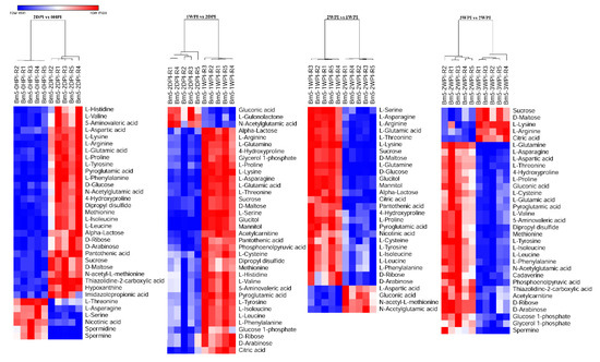 Heat maps of differential levels of metabolites at different time points after CrPV infection: Comparison between consecutive stages of infection. Hierarchical clustering was used to separate individual samples (X-axis). The Y-axis represents individual metabolites that were identified and differentially expressed with respect to preceding and following time points. The profile of targeted metabolites showed a clear separation among consecutive stages at different time points after CrPV infection in Bm5 cells. Normalized signal intensities are visualized as a color spectrum in the heat maps. Red represents high expression, and blue represents low expression of dysregulated metabolites. Different heat maps compare different time points after CrPV infection (5 repeats of each).