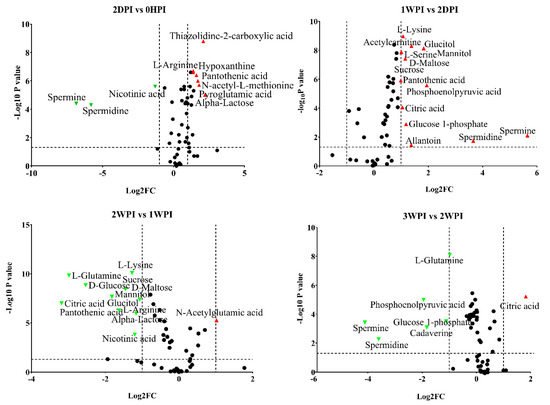 Volcano plots of all identified metabolites in Bm5 cells at different time points of CrPV infection: Comparison between consecutive stages of infection. In the volcano plot, the log scaled value of the fold change (FC, x-axis) is plotted against the –log 10 p-value from multiple t-test analysis (y-axis). The dashed lines delineate metabolites with fold change > 2 and p-value < 0.05. Compound identities are displayed for both upregulated (right side; red upward triangle) or downregulated (left side; green downward triangle) metabolites. Different volcano plots compare different time points after CrPV infection (5 repeats of each).