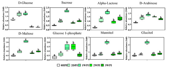 Abundance analysis of the carbohydrates identified in Bm5 cells from different CrPV infection stages. The data shown are mean ± SE (n = 5). Different letters indicate significant differences (p < 0.05, one-way ANOVA followed by Tukey’s HST test).