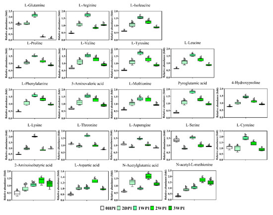 Abundance analysis of the amino acids identified in Bm5 cells from different CrPV infection stages. The data shown are mean ± SE (n = 5). Different letters indicate significant differences (p < 0.05, one-way ANOVA followed by Tukey’s HST test).