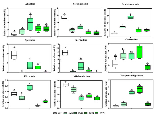 Abundance analysis of key metabolites identified in Bm5 cells from different CrPV infection stages. The data shown are mean ± SE (n = 5). Different letters indicate significant differences (p < 0.05, One-way ANOVA followed with Tukey’s HST test).