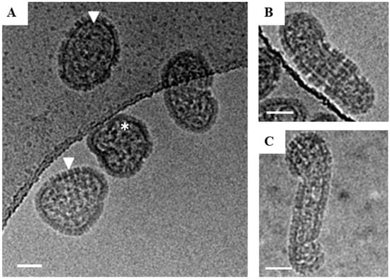 Cryo-EM images of glutaraldehyde-fixed HTNV particles. Examples of the three classes of virions observed in Holey Carbon grids by cryo-EM are presented. (A) Examples of round HTNV particles are indicated by a white triangle. The Asterix denotes an irregular shaped, crumpled ball. (B) An example of a tubular particle, which were those with their length at least twice their diameter. (C) An example of an irregular particle with a hybrid of round and tubular portions. Scale bar = 50 nm.
