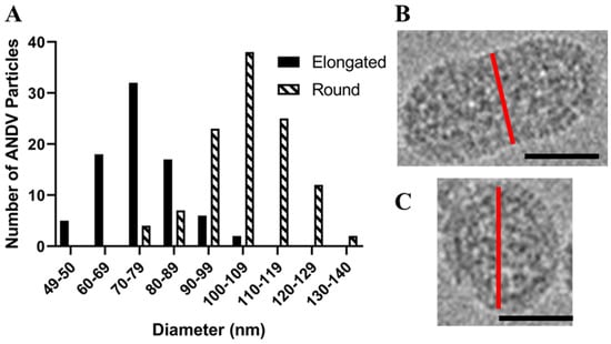 Histogram of ANDV diameters for round and tubular particles. (A) The diameter of 112 round and 80 tubular ANDV particles in cryo-EM images were measured and graphed in the above histogram. Panels (B,C) illustrate the axis (red line) by which diameters of elongated versus round particles were measured. Scale bars are 50 nm.